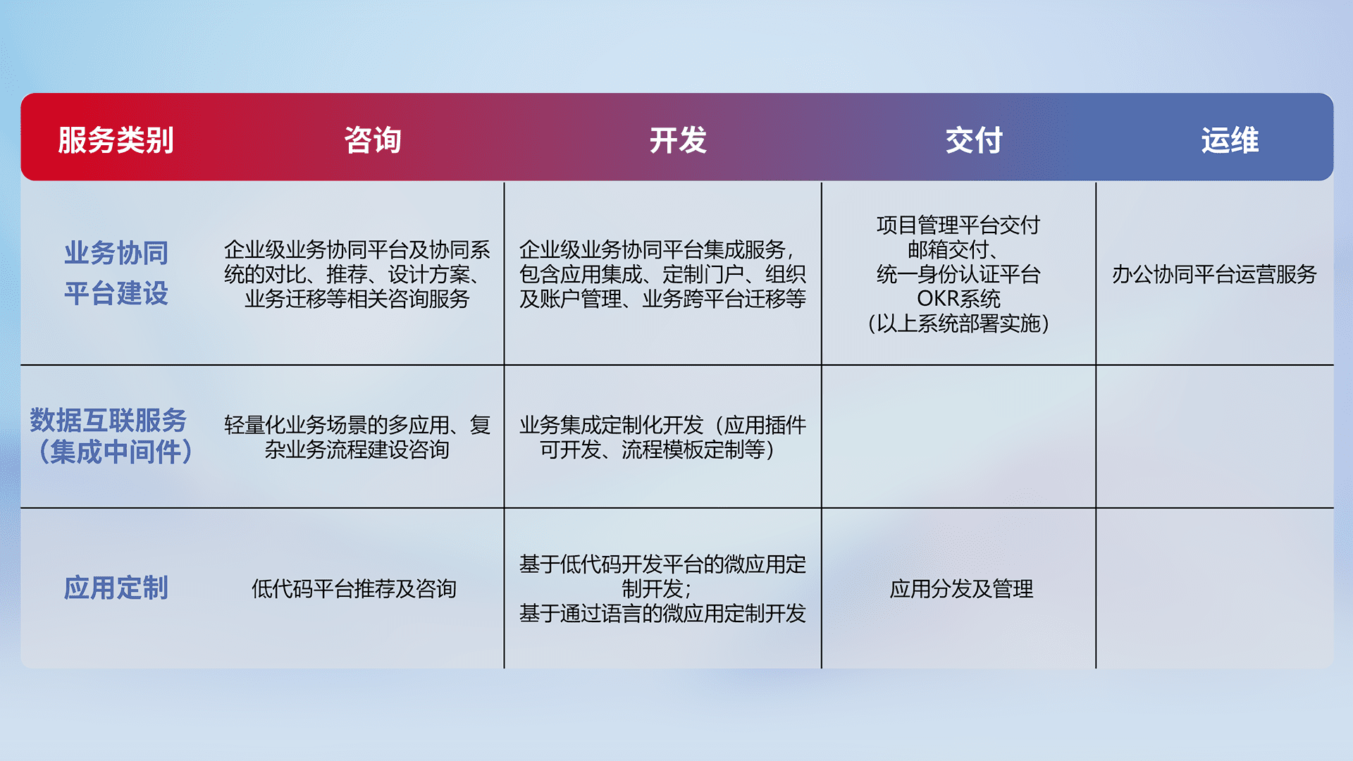 针对钉钉、、、、企微、、IDaas等平台级产品提供产品的规划、、、方案、、、交付、、、定制化开发等服务,,,,实现如统一协同办公、、智能客户服务、、混合会议管理、、、、智能数据查询、、、、等业务场景,,,,实现数字化转型。。。