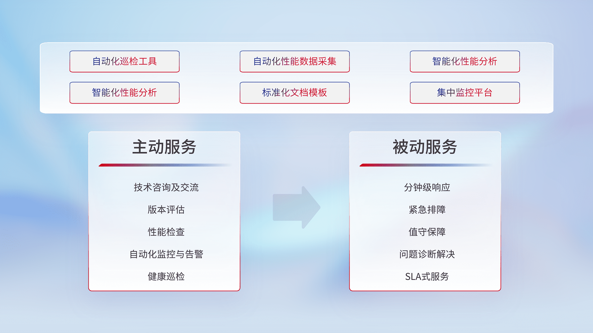 智能化工具和标准化文档,,,保障服务质量,,,,提供主动服务(包含技术咨询、、、版本评估、、、性能检查、、自动化监控与告警、、、健康巡检)和被动服务包含(分钟级响应、、紧急排障、、值守保障、、、、问题诊断解决、、、SLA服务)。。